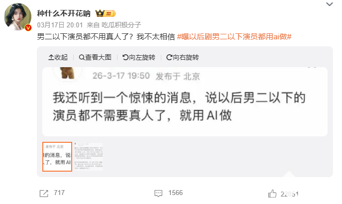 消息一经传播,网友观点便呈现两极分化。支持者认同AI工具拥有能够缩短成本的优势;反对者则指出,AI表演缺乏真实情感与临场反应,易导致角色同质化,违背艺术行业真实表达的本质。同时,群演、中腰部演员的就业空间会因此受到挤压,新人入行困难加剧。