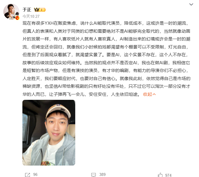 对此,知名编剧于正表示,这只是一时的潮流,真人的表演和人类的情感绝不是AI能够完全取代的,建议行业不必过分担忧。