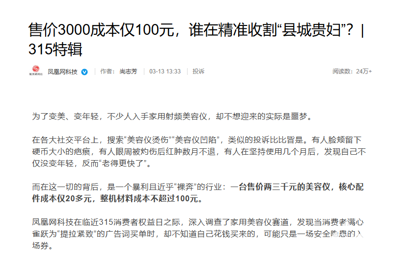 报道称,极萌“大熨斗Pro”系列当前跳水价约1300元,其核心配件成本仅20多元,出厂成本100元出头;售价7000元的“胶原炮”系列,即便增加光组件,整体材料成本也仅120元左右。