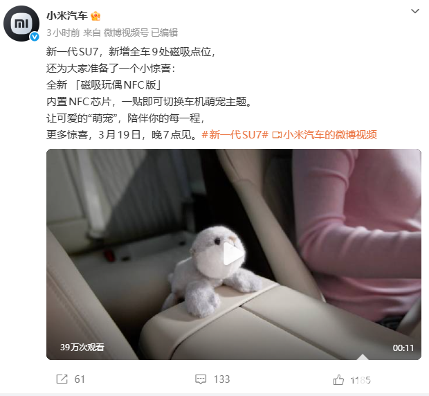 PChome 3月18日消息,小米汽车官方于今日公布了新一代SU7座舱新功能,新车新增全车9处磁吸点位,并推出NFC磁吸玩偶,内置芯片实现一贴触发,可快速切换车机萌宠主题。