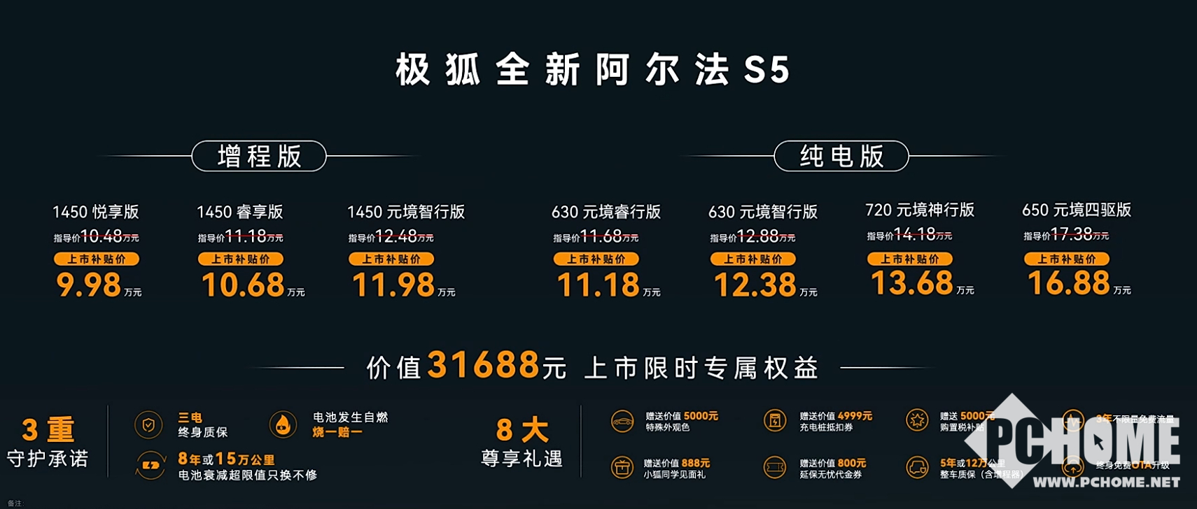 据PChome了解,全系7款车型,包含3款增程版与4款纯电版,补贴后售价区间9.98万-16.88万元。限时权益总价值31688元,含三电终身质保、电池自燃“烧一赔一”、8年/15万公里电池衰减超限值免费换新,增购用户可同步享受,除此之外还赠5000元购置税补贴、特殊车色(幻影绿/熔岩灰/瓦纳蓝)、充电桩抵扣券及终身免费OTA升级。
