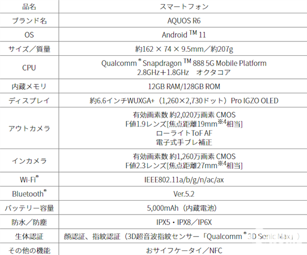 硬件方面,AQUOS R6手机使用了骁龙888,12GB内存,128GB闪存起,电池容量5000mAh,还支持IP68防尘防水等。