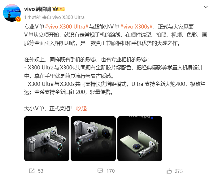 PChome 3月19日消息,vivo产品经理韩伯啸今日正式公布了旗下X300 Ultra与X300s两款新机外观,共同推出全新胶片绿配色,分别定位为“专业V单”与“超能小V单”,宣称“是一款真正兼顾相机和手机优势的大成之作”。