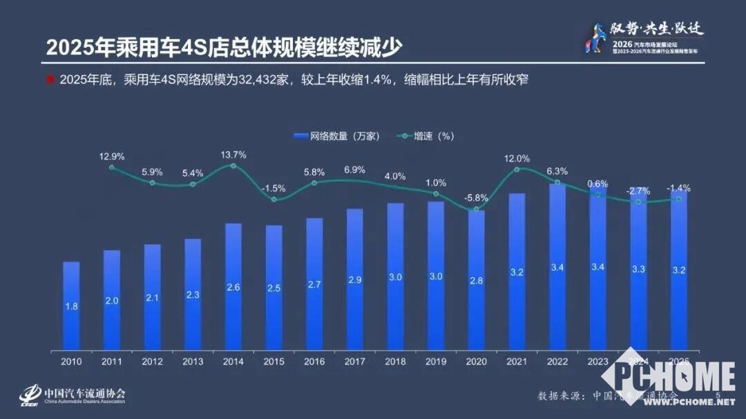 PChome 3月19日消息,昨日,中国汽车流通协会发布的《2025-2026年度中国汽车流通行业发展报告》显示,2025年乘用车4S店总体规模持续减少,总量为32432家,同比收缩1.4%,收缩幅度较上一年度有所收窄。
