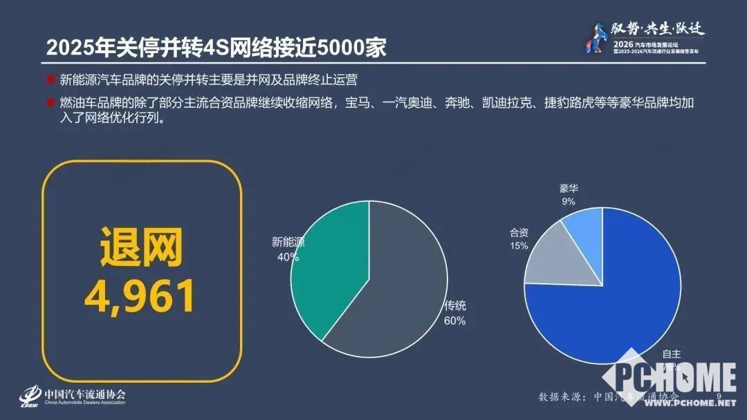 数据显示,2025全年关停并转4S店数量接近5000家,其中新增网络中的新能源汽车品牌约占56%,自主品牌份额达88%,合资品牌和豪华品牌所占份额则分别为7%和5%;而退网的近5000家4S网络中,自主品牌占比76%,合资、豪华品牌分别占15%、9%,传统燃油车板块持续收缩,占比60%,行业生存压力显著加剧。