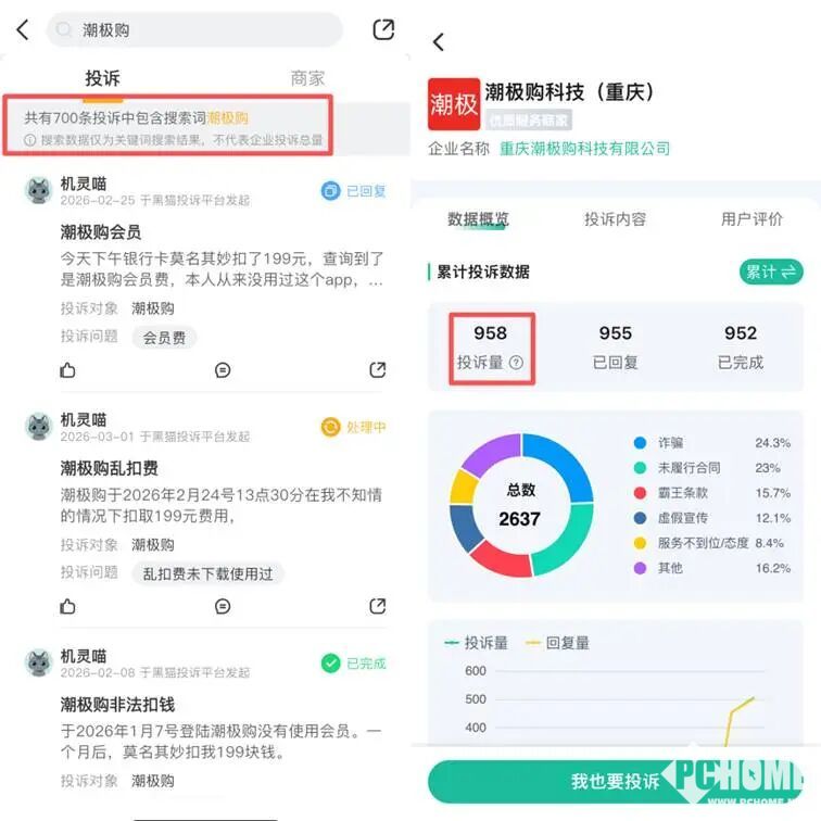 PChome 3月19日消息,据《新黄河·大鱼财经》报道,近日,潮极购App因未经授权自动扣费、诱导开通会员等问题引发大量用户维权,黑猫投诉等平台相关投诉总量已达上千起,涉事主体为重庆潮极购科技有限公司。