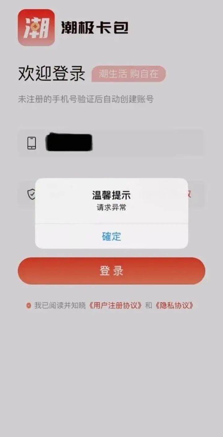 目前,潮极购App已无法正常登录,使用App登录账号时,界面显示为潮极卡包,平台多次弹窗提示“请求异常”。