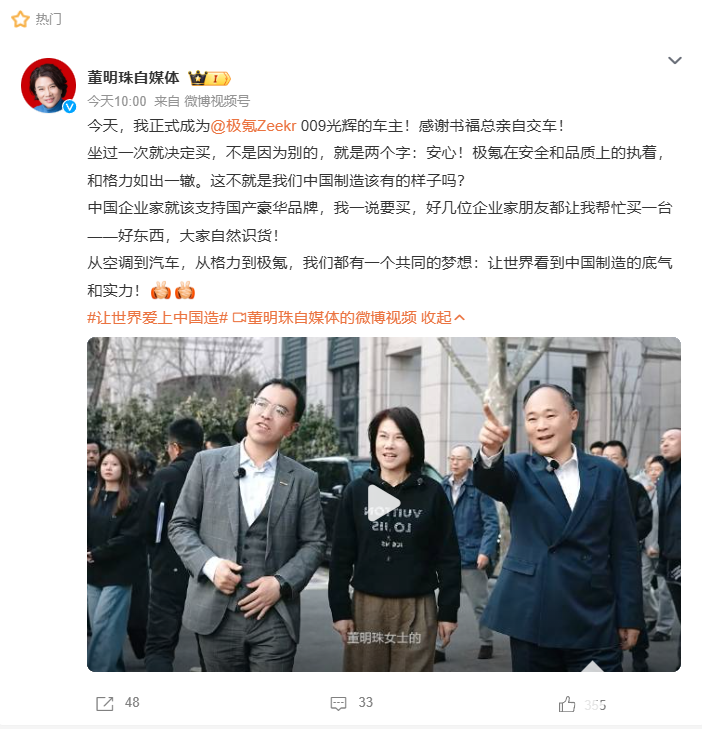 顶级企业家以往偏好迈巴赫等海外豪车,董明珠此举也被视为国产车打破外资垄断的标志。