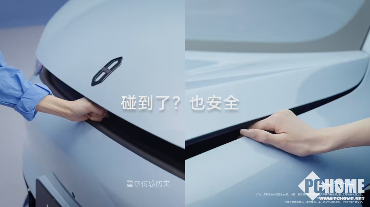 新车搭载的智能电动前备箱,纯电后驱版容积至高202L,四驱版为140L。从视频中可见,202L大容量可轻松收纳20寸+24寸行李箱,适配露营装备、母婴用品等出行载物需求;支持双击“敲一敲”、隔空手势、车外语音等多方式开启,兼具实用性与科技感;同时采用多重防夹设计,支持正向霍尔传感防夹、侧向防夹条防夹,遇障自动回弹,保障使用安全。