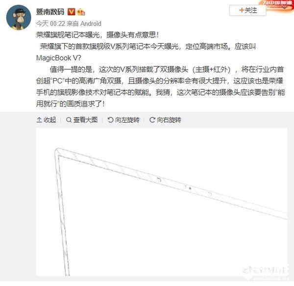 和其他笔记本不同的是,根据该博主放出的图片,荣耀MagicBook V搭载了双摄像头,包括一颗主摄像头和一颗红外摄像头,将在行业内首创超“PC”中的高清广角双摄像头,而且摄像头的分辨率会有很大提升。“这应该也是荣耀手机的旗舰影像技术对笔记本的赋能”。这次,荣耀笔记本的摄像头应该要告别“能用就行”的画质追求。