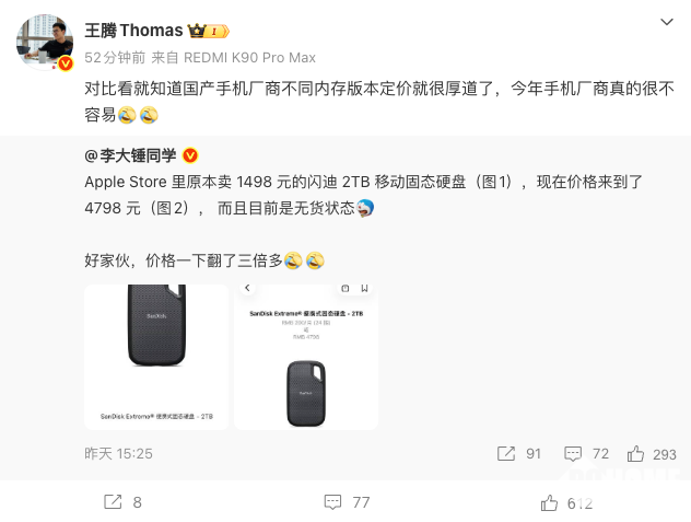 3月19日消息,数码博主“李大锤同学”发文称,苹果Apple Store里原本卖1498元的闪迪2TB移动固态硬盘,现在价格来到了4798元,价格翻了2.2倍,而且目前是无货状态。