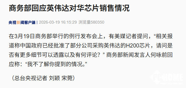 PChome 3月19日消息,据《央视新闻》报道,在今日商务部举行的例行新闻发布会上,有美媒记者询问中国政府是否已批准部分企业采购英伟达H200芯片,商务部新闻发言人何咏前当场回应称:“我不了解你提到的情况。”