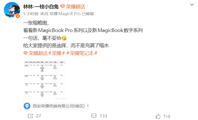 PChome 3月19日消息,荣耀中国区智慧生活业务部部长“林林”今日发布一张缩略图,正式公开了荣耀新款MagicBook Pro系列以及MagicBook数字系列的部分配置,产品将迎来性能、屏幕、接口全面升级。