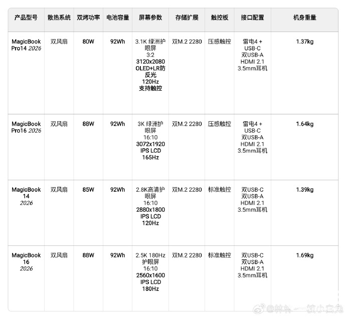 本次曝光的MagicBook Pro 14 2026款将搭载双风扇散热系统实现80W稳定性能释放;配备92Wh大电池、3.1K 3:2比例120Hz OLED绿洲护眼屏,支持触控;存储采用双M.2 2280 SSD插槽,扩展性大幅提升;接口方面配备雷电4,搭配全功能USB‑C、USB‑A、HDMI 2.1等,组成全能接口方案。