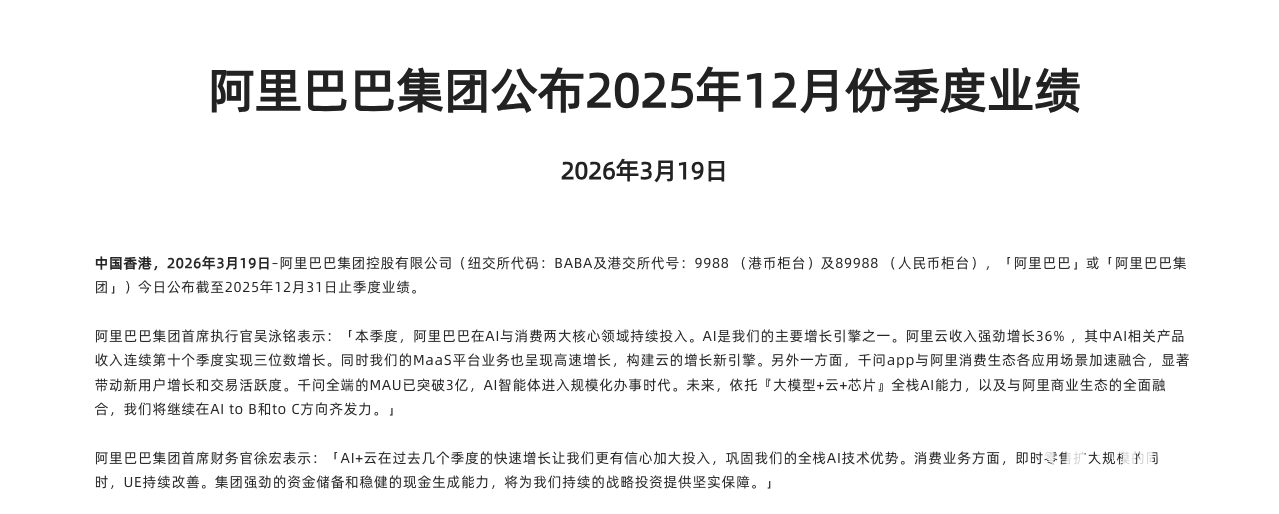 阿里巴巴集团首席执行官吴泳铭表示,AI是公司的主要增长引擎之一。未来,阿里巴巴将继续依托“大模型+云+芯片”的全栈AI能力,在服务企业(to B)与消费者(to C)两个方向上共同发力。首席财务官徐宏则指出,集团强劲的现金储备将为持续的AI等战略投资提供坚实保障。这份财报清晰表明,阿里巴巴正将战略资源持续向AI倾斜,以期在技术竞争与生态融合中构筑新的护城河。