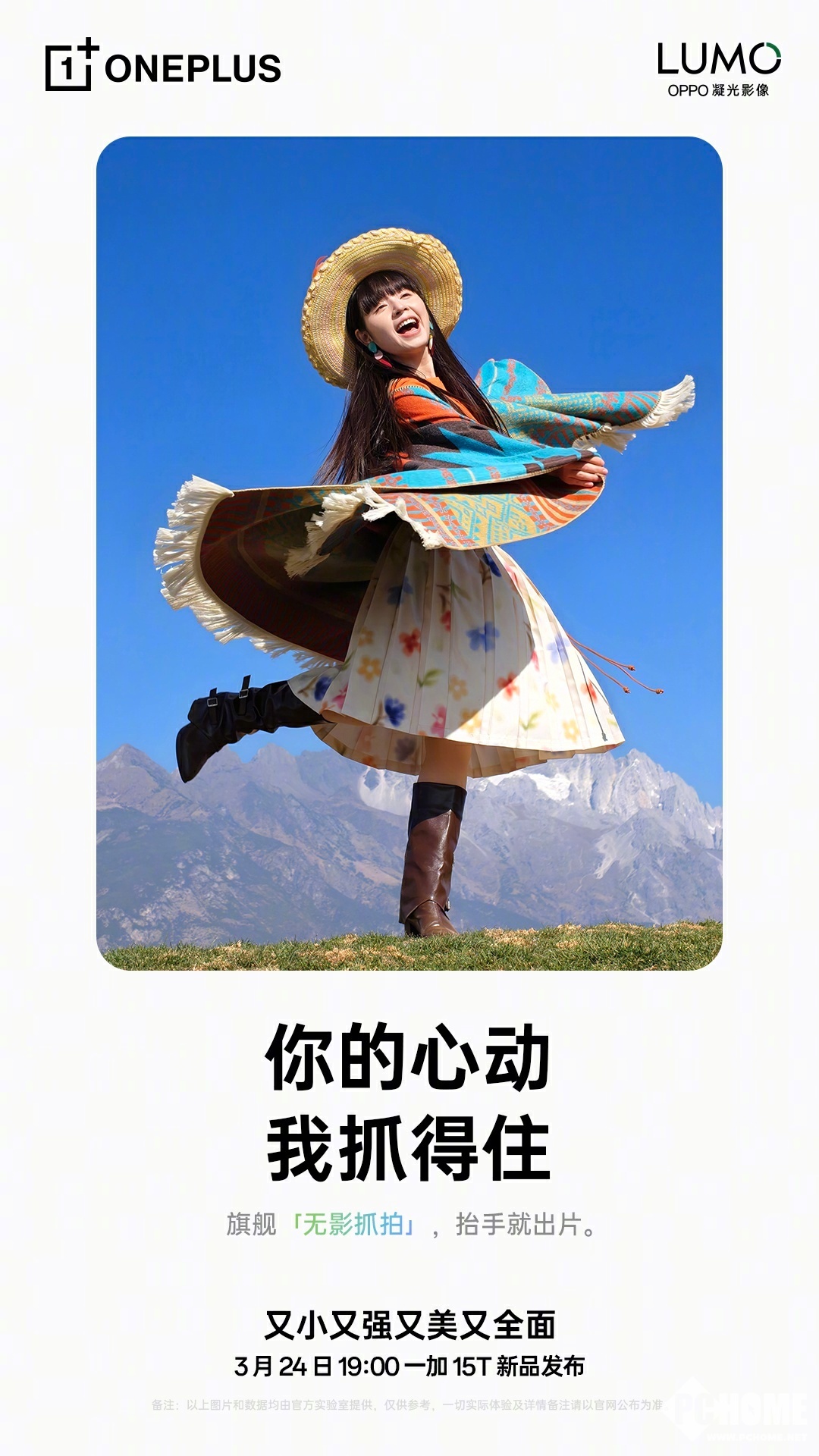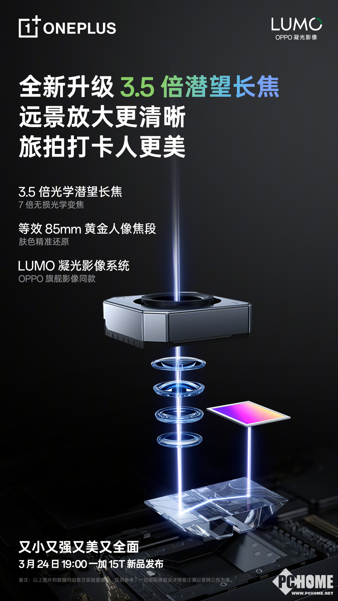 PChome 3月20日消息,一加手机官微官宣,一加15T采用LUMO凝光影像,搭载3.5倍潜望长焦镜头,支持“超多旗舰影像玩法,超清晰,超丰富,超有趣”。