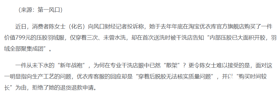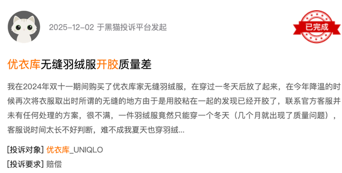 当事人陈女士称,提供购买凭证与干洗店检测说明后,优衣库客服却以“购买时间较长”“穿着后脱胶无法核实质量问题”为由,拒绝退换与售后处理。该事件引发广泛关注,不少网友也反映同款该品牌羽绒服存在类似开胶、跑绒等质量问题,黑猫投诉等平台已有多条相关投诉。