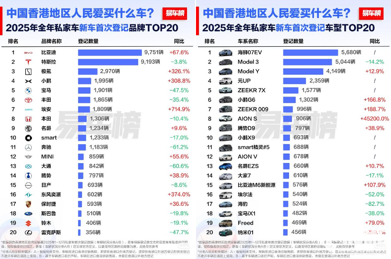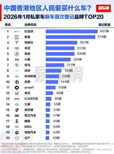 去年年初,比亚迪便已显现领跑态势。香港运输署数据显示,2025年1月比亚迪新车注册量为849辆,登顶单月销量榜首 。进入年中,凭借海狮07EV、海豹、元PLUS等车型的强劲表现,比亚迪连续多月成为香港市民最青睐的汽车品牌;上半年累计销量达4902辆,超越特斯拉(3889辆)位居市场第一,市场占有率高达26.71% 。全年力挫特斯拉,新车登记9751辆创下历史新高,较2024年同比劲增68%,毫无悬念地斩获 2025 年香港全品牌销量桂冠。2026年伊始,比亚迪稳扎稳打,新车销量继续保持领先势头。