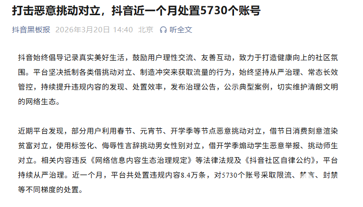 PChome 3月20日消息,公众号“抖音黑板报”发文称,近一个月内针对平台内恶意挑动群体对立、制造舆论冲突等违规行为开展了专项整治,共处置违规内容8.4万条,对5730个账号采取限流、禁言、封禁等不同梯度的处罚。