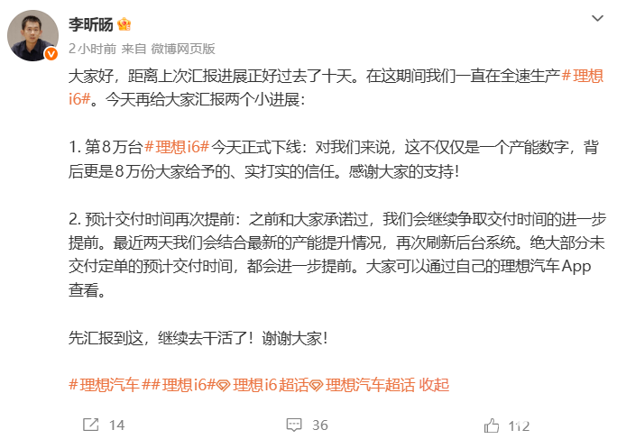 PChome 3月20日消息,理想汽车产品线负责人李昕旸宣布,第8万台理想i6已于今日正式下线。并表示,近期团队会根据最新的产能提升情况,同步刷新未交付订单的预计交付时间,用户可通过理想汽车App查询最新进度。