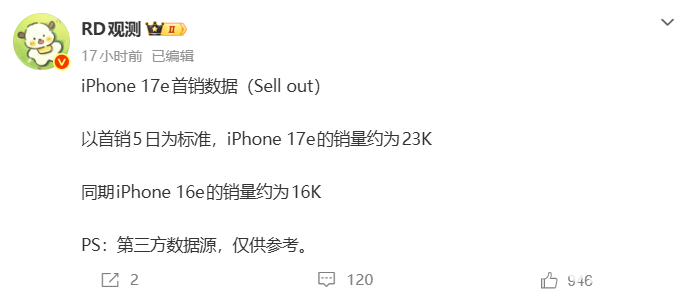 PChome 3月20日消息,据博主“RD观测”昨日发文分享的iPhone 17e首销数据显示,该机首销5日内销量约为2.3万台,表现优于上一代iPhone 16e同期的1.6万台销量,市场表现持续火爆。