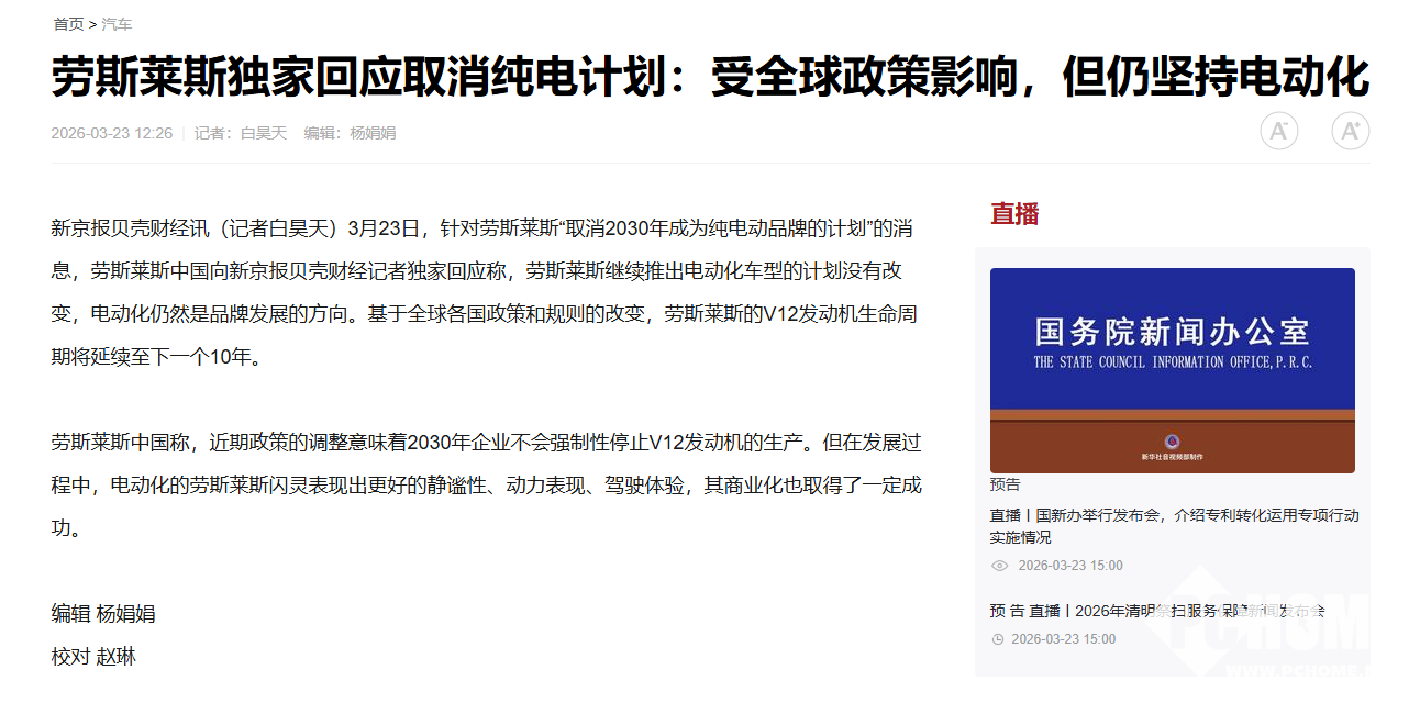 PChome 3月23日消息,针对劳斯莱斯“调整2030年全面电动化目标、暂缓纯电转型”的相关传闻,劳斯莱斯中国官方向新京报贝壳财经记者回应称,此次战略调整是受全球汽车产业政策变动影响,电动化依旧是品牌长期发展方向,推出电动化车型的计划并未改变。