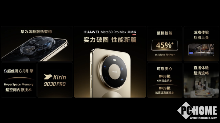 据PChome了解,性能方面华为Mate 80 Pro Max风驰版搭载麒麟9030 Pro芯片,核心亮点在于行业首创的主动风冷散热系统与软硬协同的深度优化,整机性能较上一代提升高达45%,内置12mm磁悬浮涡轮风扇,配合仿生羽翼涡扇设计与超导热弯流翅片,大幅提升了风量并优化了气流路径,高负载场景不降频,支持HyperSpace Memory超空间内存技术,16GB运存等效20GB体验,后台应用驻留能力提升67%。