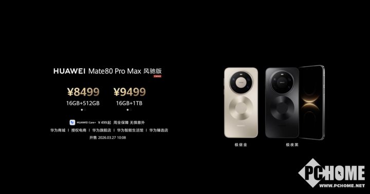 PChome 3月23日消息,华为Mate 80 Pro Max风驰版今日以8499元起售价格正式上市,包含16GB+512GB版本(售价:8499元)与16GB+1TB版本(售价:9499元)。