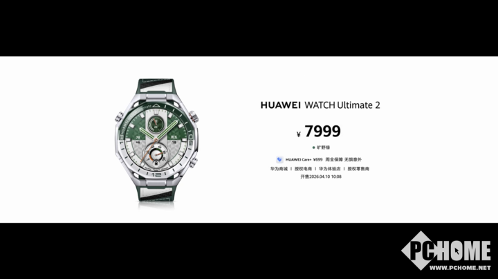 PChome 3月23日消息,在今日举行的华为春季全场景新品发布会上,华为WATCH Ultimate 2非凡探索“旷野绿”正式发布,定价7999元,即日起开启预售,将于4月10日正式开售。