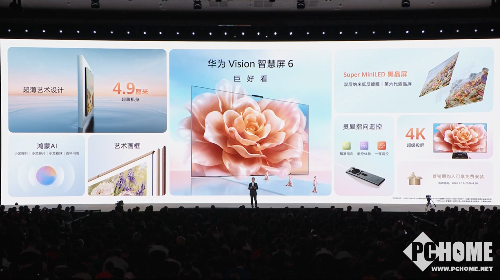 PChome 3月23日消息,在今日举行的华为春季全场景新品发布会上,华为Vision智慧屏6宣布正式开售。新品定位中高端智慧大屏,以Super MiniLED黑晶屏、超薄美学设计与鸿蒙AI交互能力,打造家庭娱乐与智慧互联中心。