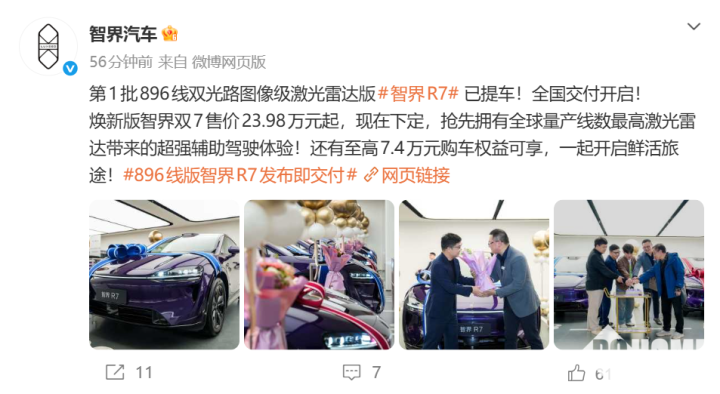 此次交付依托智界超级工厂与全链路供应链体系,展车已全国到店,用户可通过华为商城、鸿蒙智行APP下定,至高7.4万元购车权益可享。
