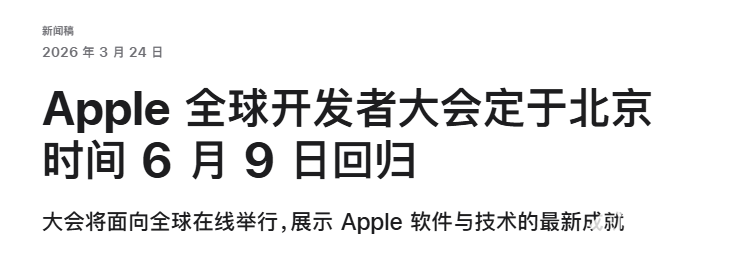 PChome 3月24日消息,苹果官方今日正式宣布,2026全球开发者大会(WWDC26) 将于北京时间6月9日至13日举行。