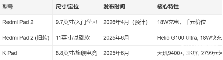 REDMI Pad 2(9.7 英寸)与K90至尊版已确认通过入网认证,预计将于2026年4月正式发布。REDMI Pad 2配备18W充电头,屏幕尺寸明确为9.7英寸,定位千元级学习平板。