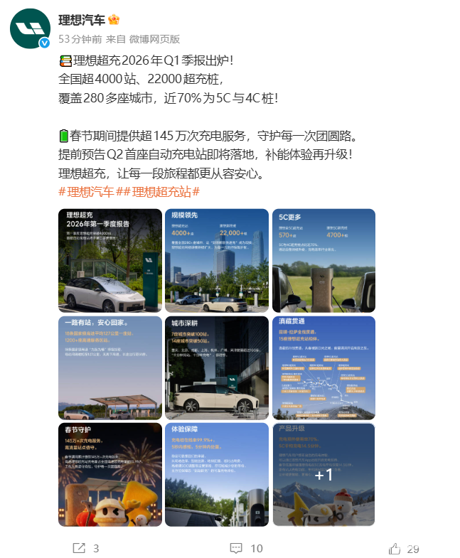 官方提到,春节期间理想超充累计提供超145万次充电服务,全网在线率保持99.9%以上,全方位提供“到站即充”的可靠体验。