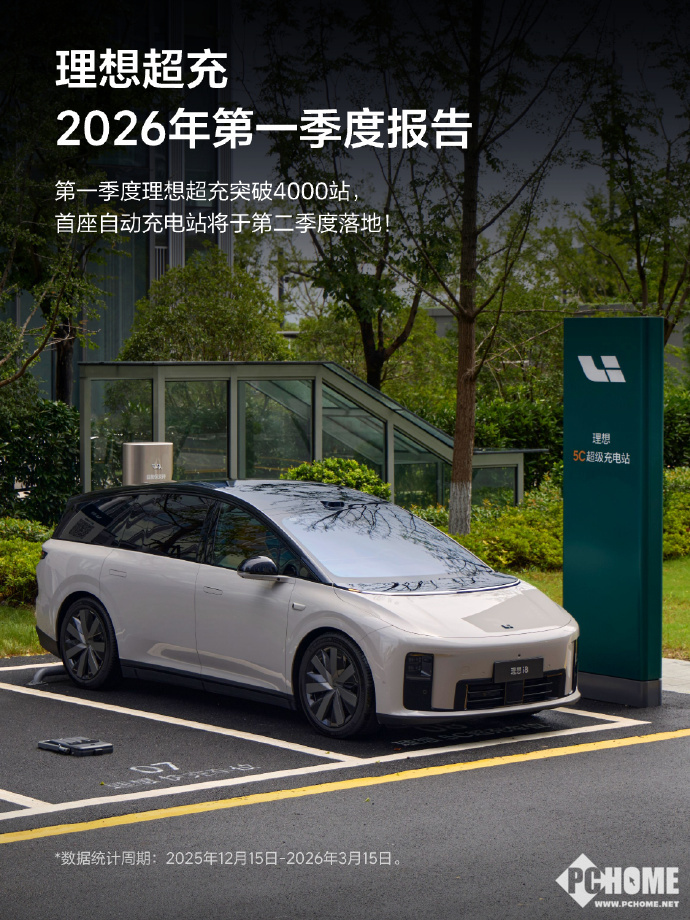 PChome 3月24日消息,理想汽车今日公布2026年第一季度补能网络最新数据。在2025年12月15日至2026年3月15日期间,理想已在全国建成超4000座超充站、22000个超充桩,覆盖280余座城市,其中5C与4C超充桩占比近70%,充电效率持续领先。