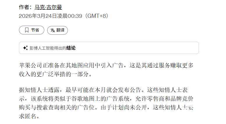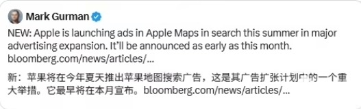 PChome 3月24日消息,据彭博社记者“Mark Gurman”报道,苹果公司计划在Apple Maps中新增广告功能,允许品牌与商家通过竞价购买搜索广告位,相关公告最快将于本月内发布。