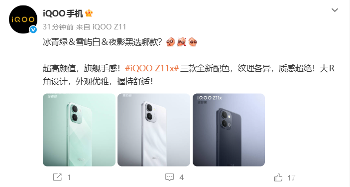 从官方图来看,iQOO Z11x延续简约潮流设计理念,外观优雅、机身线条流畅,大R角过渡自然,有效提升单手持握体验;三款配色风格分明、纹理各异,满足不同用户审美需求。