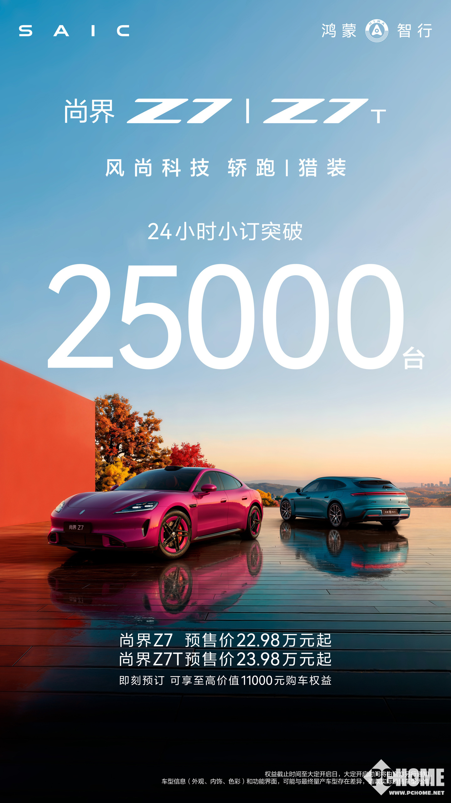 PChome 3月24日消息,鸿蒙智行官宣,尚界Z7、Z7T新车24小时小订已突破2.5万辆。两款产品的预售起售价分别为22.98万元和23.98万元。