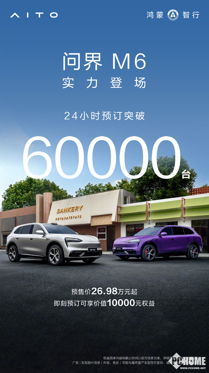 PChome 3月24日消息,华为余承东于今日宣布鸿蒙智行问界M6 SUV预售24小时订单突破6万台,成为问界品牌继M7之后又一现象级爆款车型,引发市场对国产新能源智能化技术实力的高度关注。