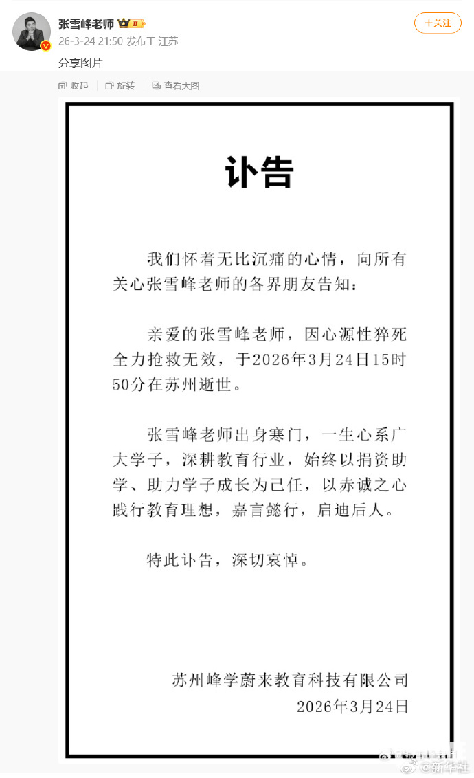 PChome 3月24日消息,考研名师张雪峰因心源性猝死全力抢救无效,于2026年3月24日15时50分在苏州逝世。张雪峰的苏州峰学蔚来教育科技有限公司已经发布讣告确认。