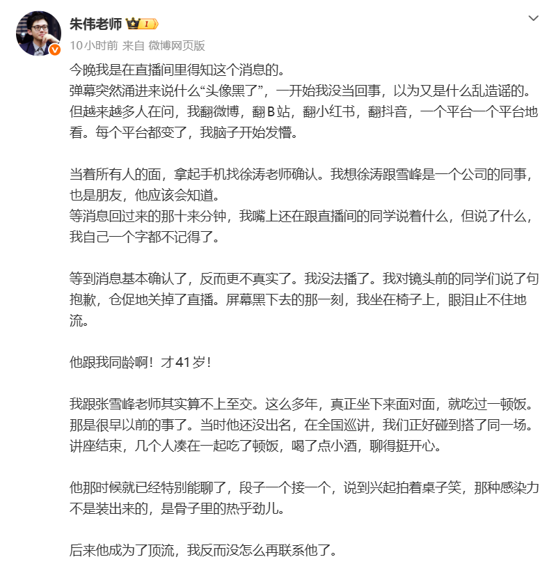 PChome 3月25日消息,昨日晚间,考研英语名师朱伟在直播中得知张雪峰猝然离世的消息后情绪崩溃,深夜发布长文悼念这位同龄同行,字里行间不仅透露出对生命无常的痛惜。
