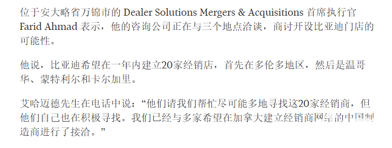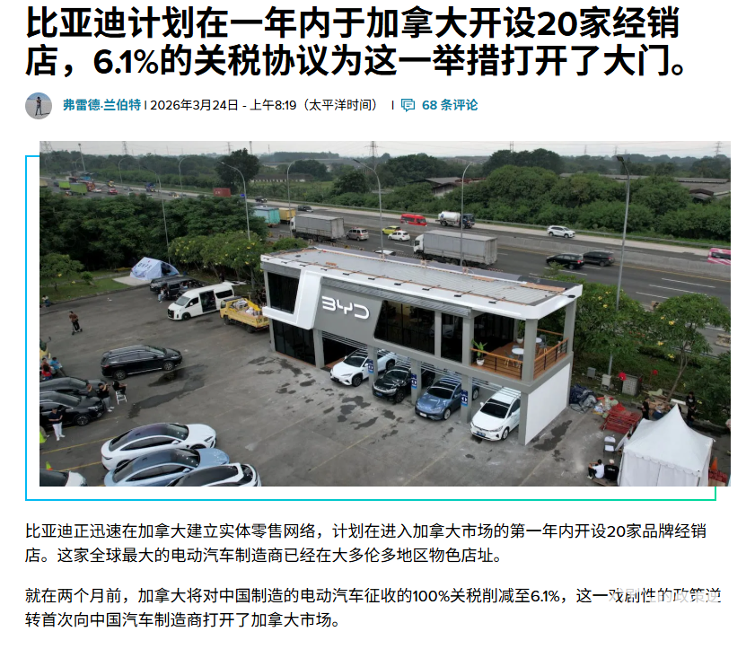 据加拿大《环球邮报》报道,比亚迪已聘请安大略省专业汽车零售咨询公司协助选址,目前大多伦多地区已有三个潜在门店点位进入洽谈阶段。按照规划,20家门店将率先以多伦多为核心落地,后续逐步拓展至温哥华、蒙特利尔、卡尔加里,搭建覆盖加拿大四大都会区的销售与服务网络。