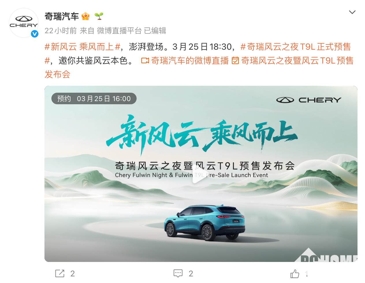 PChome 3月25日消息,奇瑞汽车官宣,“智美大五座SUV”奇瑞风云T9L将于今日18:30开启预售。