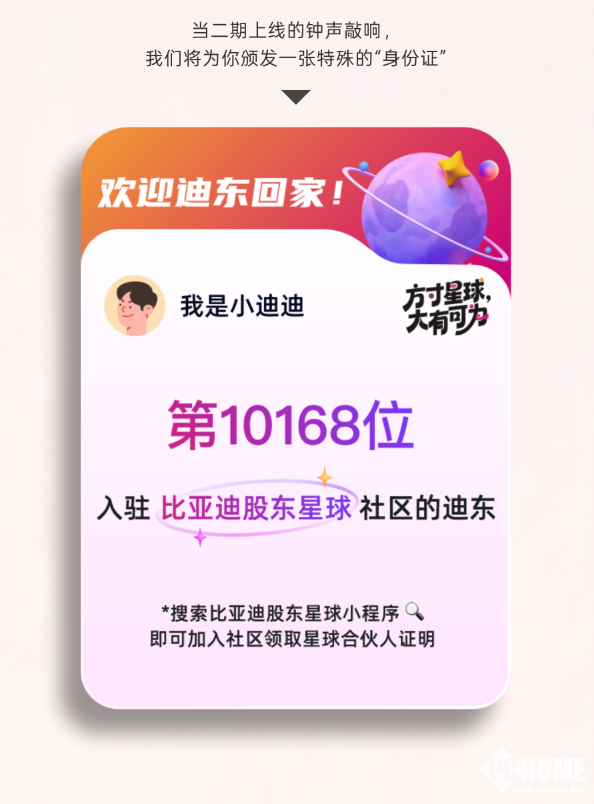 PChome 3月25日消息,今日,比亚迪正式启动“寻找比亚迪股东星球合伙人”计划,通过升级小程序推出“股东建言”功能,邀请64万股东从投资者转变为品牌共创者。