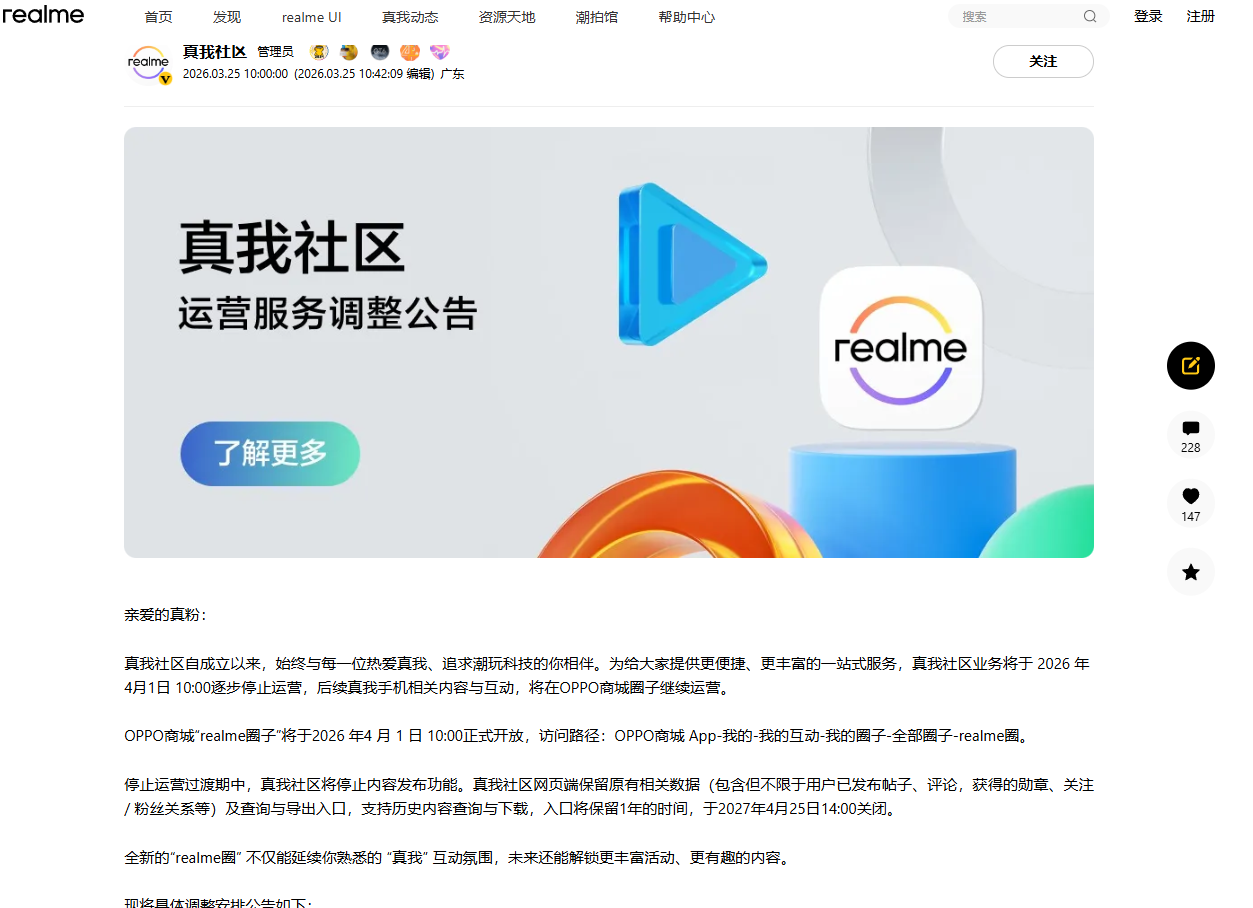 PChome 3月25日消息,真我社区管理员今日发文宣布,真我社区业务将于2026年4月1日10:00逐步停止运营,同步关闭内容发布、评论互动、勋章领取等相关功能。后续真我手机相关内容与互动,将在OPPO商城圈子继续运营。