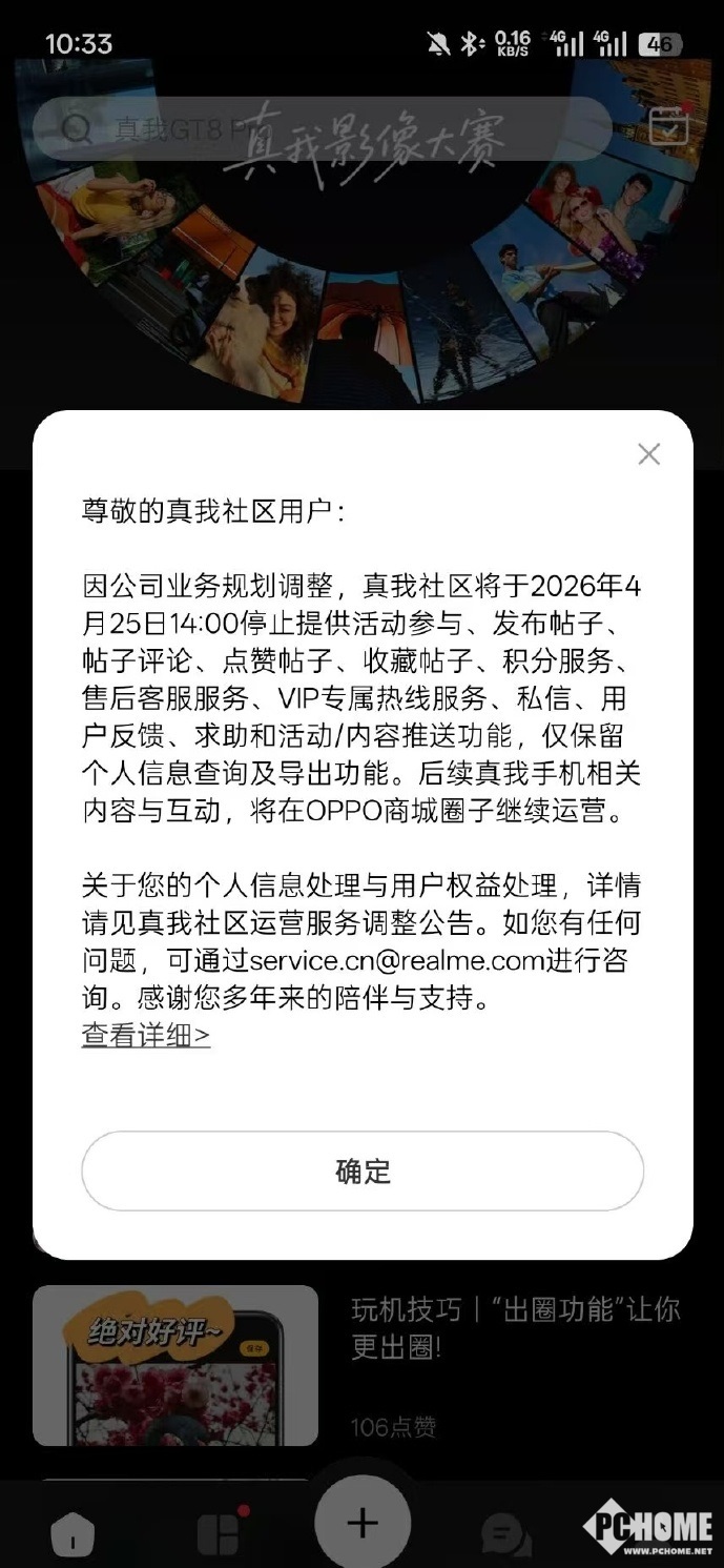 PChome 3月25日消息,真我社区管理员今日发文宣布,真我社区业务将于2026年4月1日10:00逐步停止运营,后续真我手机相关内容与互动,将在OPPO商城圈子继续运营。
