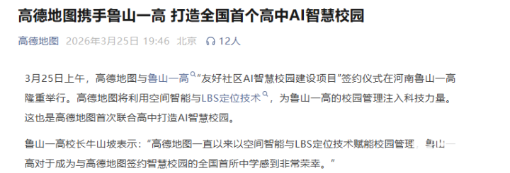 PChome 3月26日消息,高德地图昨日通过官方公众号发文宣布,正式与河南省鲁山一高签约,共同打造全国首个高中AI智慧校园项目,标志着空间智能技术首次全面赋能高中校园管理场景。