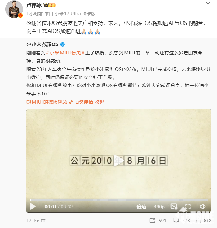 PChome 3月27日消息,近日,“小米MIUI系统停更”的消息引发行业与用户关注,对此,小米集团合伙人、总裁卢伟冰今日在微博发文回应,明确表示MIUI已正式落幕,小米未来将以澎湃OS为核心,全面向全生态AIOS加速迈进。