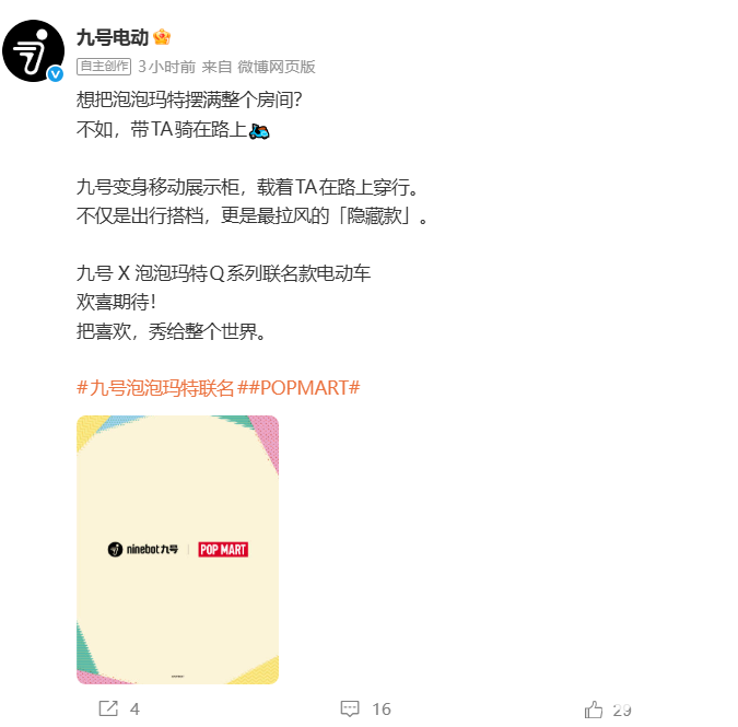 PChome 3月27日消息,九号公司今日官宣与潮流文化品牌泡泡玛特达成跨界合作,双方将联手打造IP联名款智能电动车,定于4月正式推出。