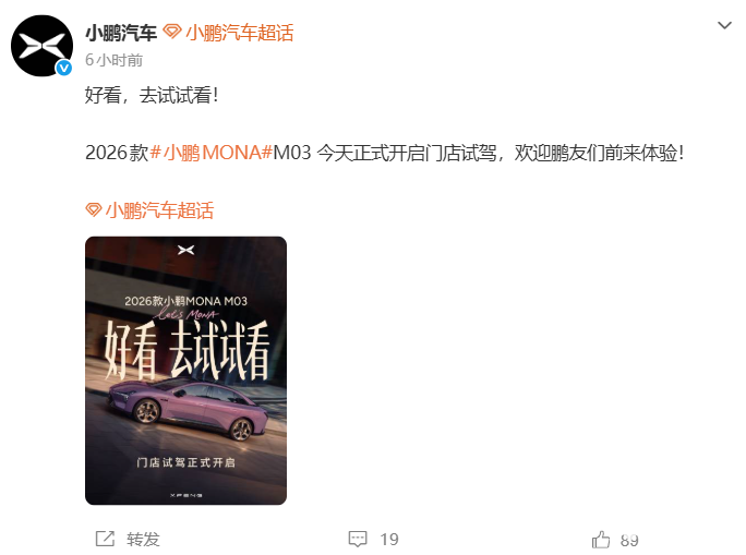 PChome 3月27日消息,小鹏汽车今日宣布2026款MONA M03正式启动全国线下门店试驾。新车以750 TOPS智驾算力与640公里CLTC续航为升级亮点,首次将高阶智能驾驶硬件规格带入2万美元(约合13.8万元人民币)以内价位区间,进一步下放智能电动技术普惠。
